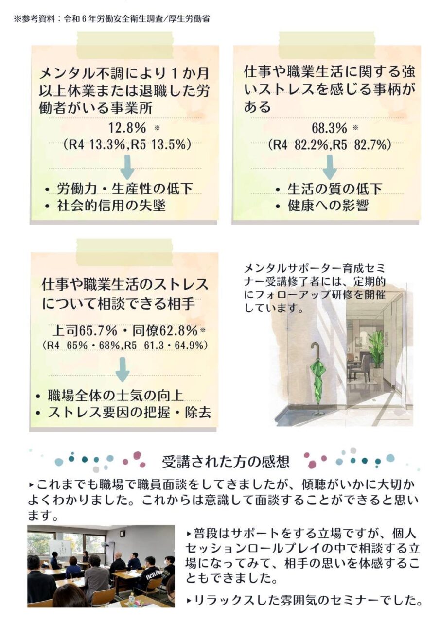 「メンタルサポーター育成セミナー」はそのようなニーズに応える内容で、参加者の皆さまからとても好評をいただいています。